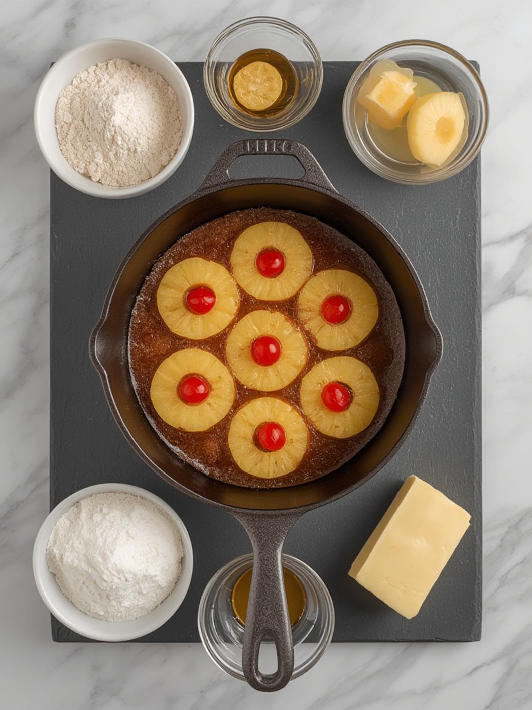 Gather your ingredients for this easy and delightful one-pan wonder. The key to a perfect upside-down cake is fresh, vibrant pineapple and a rich, moist cake batter that perfectly absorbs the caramelized goodness.
