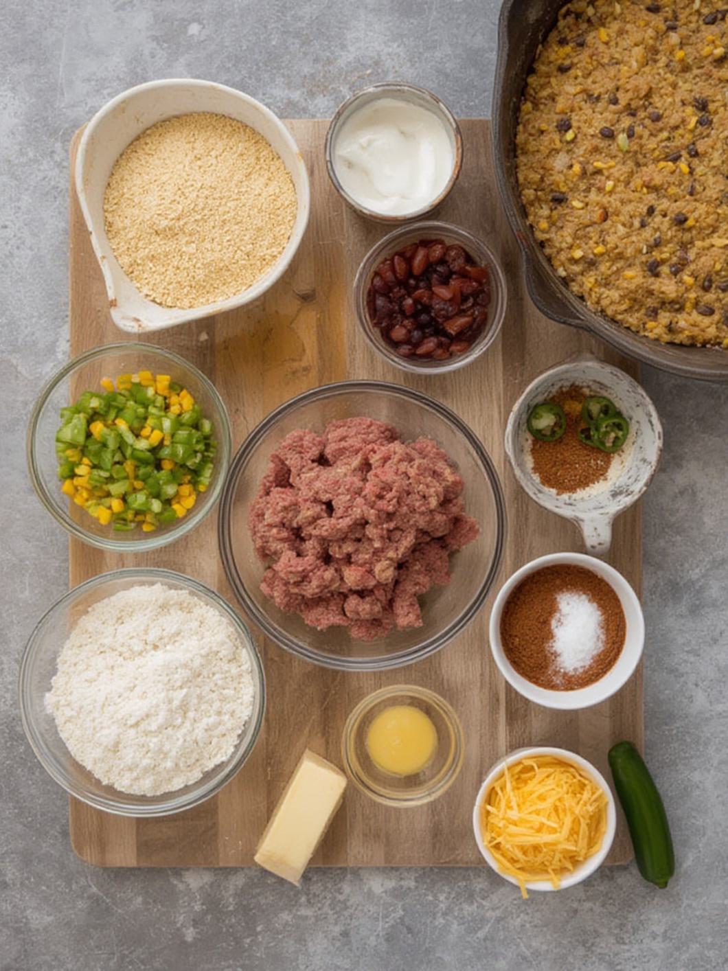 4. Prepare Cornbread Topping: In a medium bowl, whisk together the cornmeal, flour, sugar, baking powder, and salt. In a separate bowl, whisk together the milk, egg, and melted butter. Pour the wet ingredients into the dry ingredients and stir until just combined (do not overmix). Fold in ½ cup of the shredded cheddar cheese.