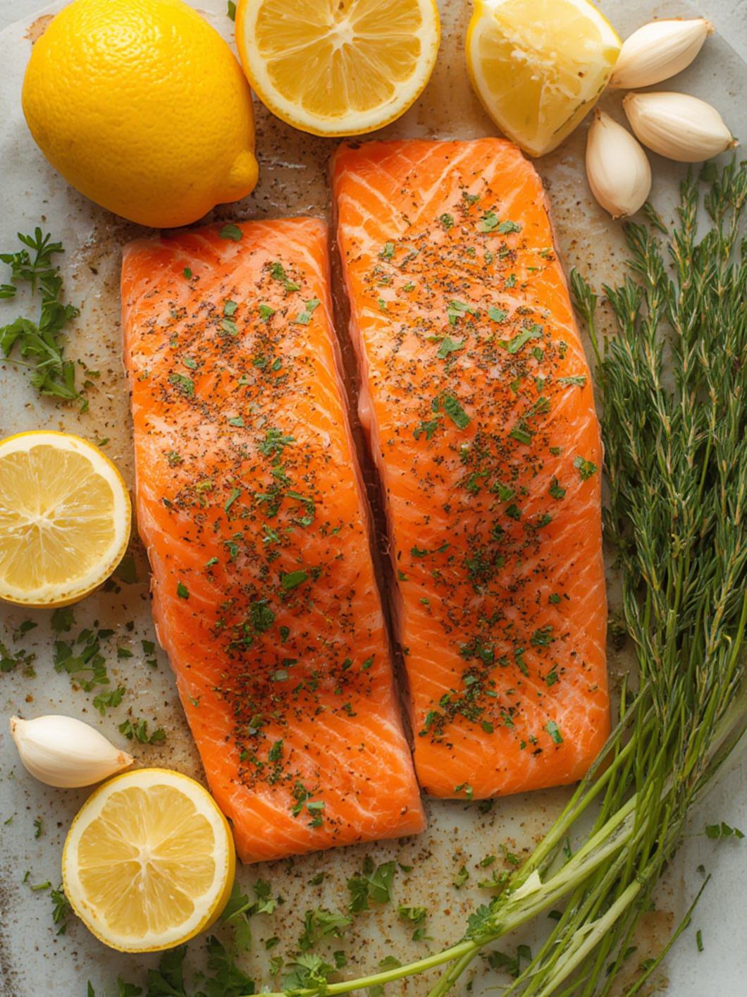 3. Season the Salmon: Lightly brush both sides of each salmon fillet with olive oil or melted butter. Then, generously coat both sides of each fillet with the seasoning mixture, pressing gently to ensure it adheres well to the fish.