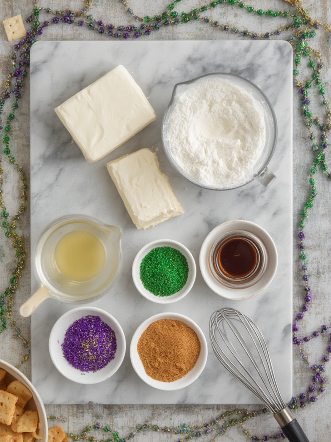This no-bake dip is a dream come true for dessert lovers! Whipped cream cheese and butter are blended with powdered sugar and extracts to create a luscious, creamy base, then topped with festive purple, green, and gold sprinkles. It’s a quick, easy, and undeniably delicious way to enjoy classic King Cake flavors without any baking, making it the ultimate party treat for any celebration.