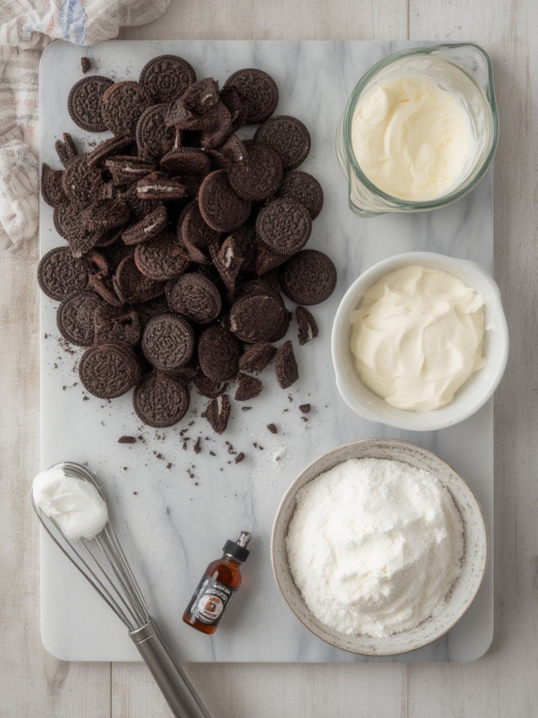 Chef’s Notes: For best results, allow the cake to chill for at least 4 hours, or preferably overnight, to allow the cookies to soften completely and create a cake-like texture. You can garnish with extra crushed Oreos or chocolate shavings before serving.